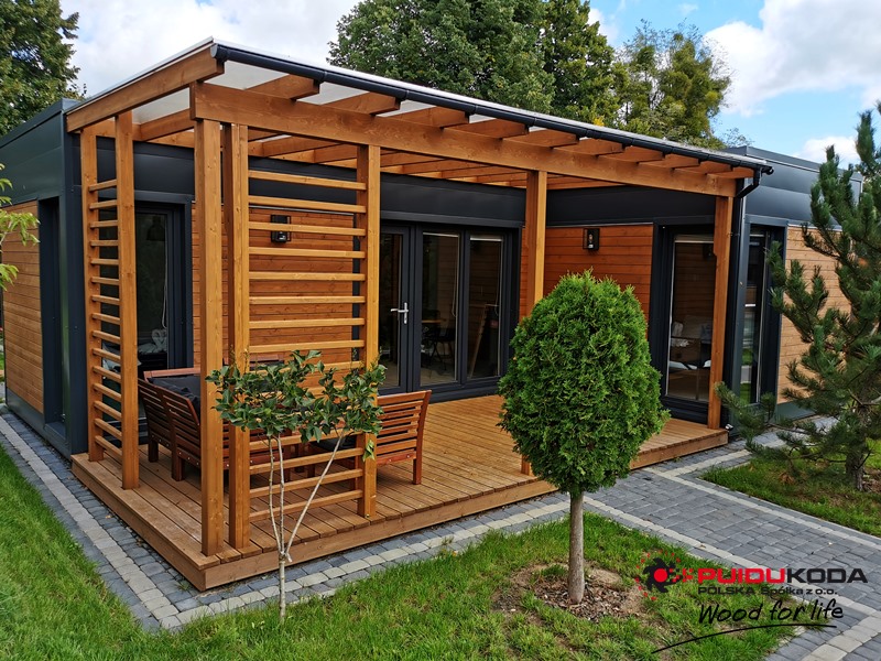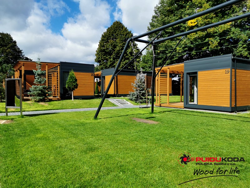 Drewniane modułowe domki letniskowe. Każde z wnętrz domków w