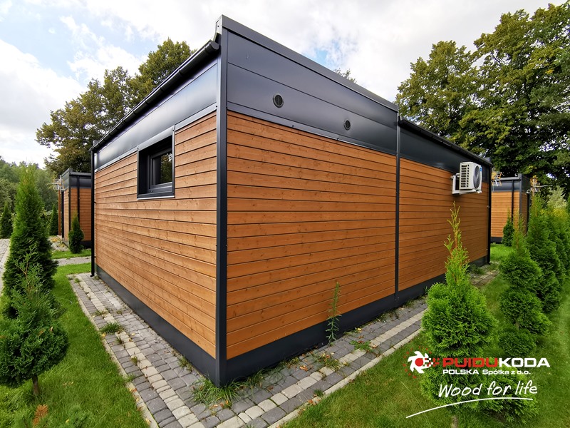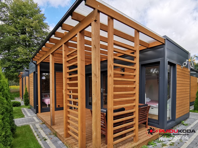 Drewniane modułowe domki letniskowe. Każde z wnętrz domków w